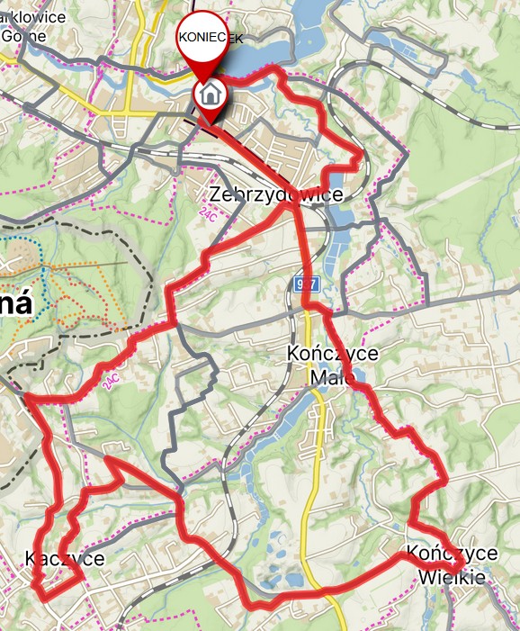 Przejdziemy tradycyjnie 25 km. Początek i koniec przy naszym kościele. Pójdziemy przez Kończyce Małe, Kończyce Wielkie, Kaczyce i zakończymy przy naszym kościele. Rok temu szliśmy prawie 6 godzin. W tym roku będzie pewnie podobnie. Na trasie planujemy jeden dłuższy odpoczynek (około 20 minut) przy kościele w Kaczycach (na przejściu 15,6 km).