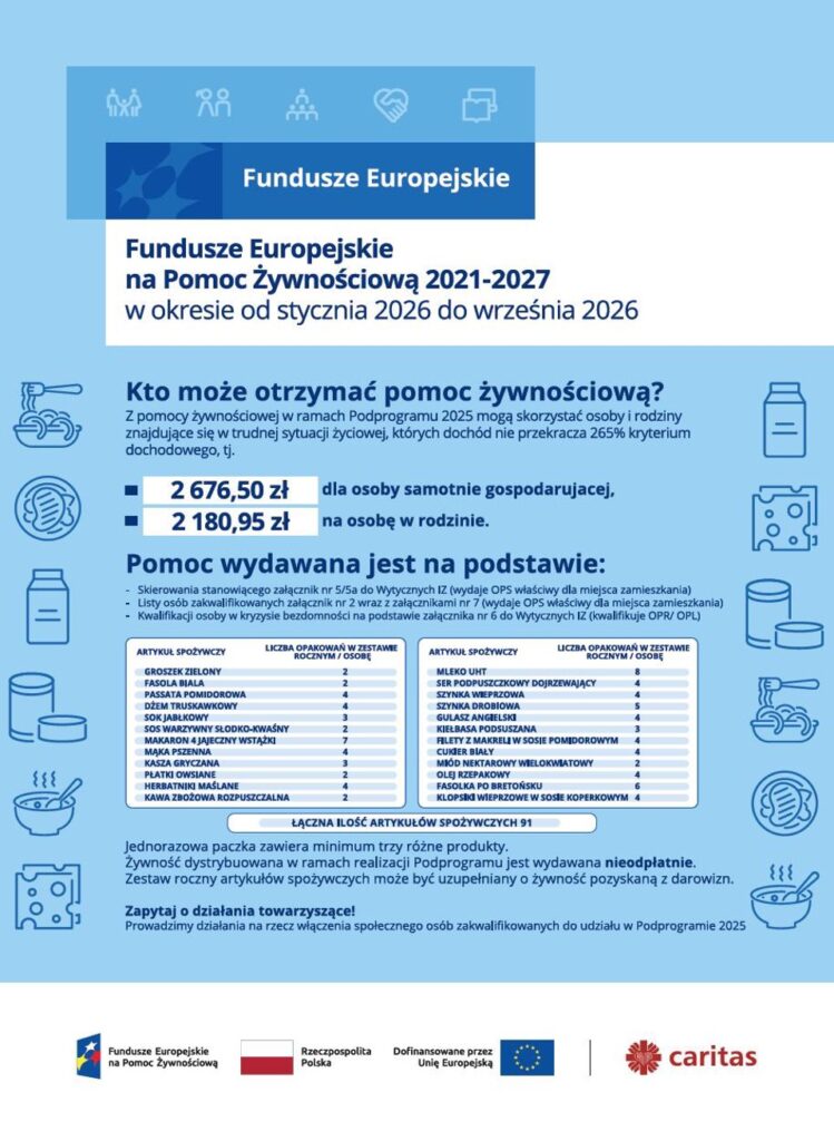 Parafia Wniebowzięcia NMP w Zebrzydowicach informuje o rozpoczęciu realizacji programu Fundusze Europejskie Pomoc Żywnościowa 2021 -2027 – „Podprogram 2025”.